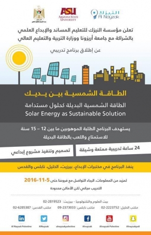 .تعلن مؤسسة النيزك للتعليم المساند والإبداع العلمي وبالشراكة مع وزارة التربية والتعليم العالي وجامعة أريزونا عن إطلاق برنامج تدريبي جديد حول الطاقة الشمسية البديلة تحت عنوان: