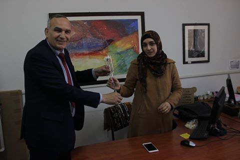 حيث قام كلاٍ من د. اسحق سدر وأ. رائد الخضور رئيس اللجنة وأعضاء اللجنة ممثلة بالأستاذ إياد زهران وأ. محمد قباجة بتوزيع الورود وهدية عينية تقديراً لجهودهم.