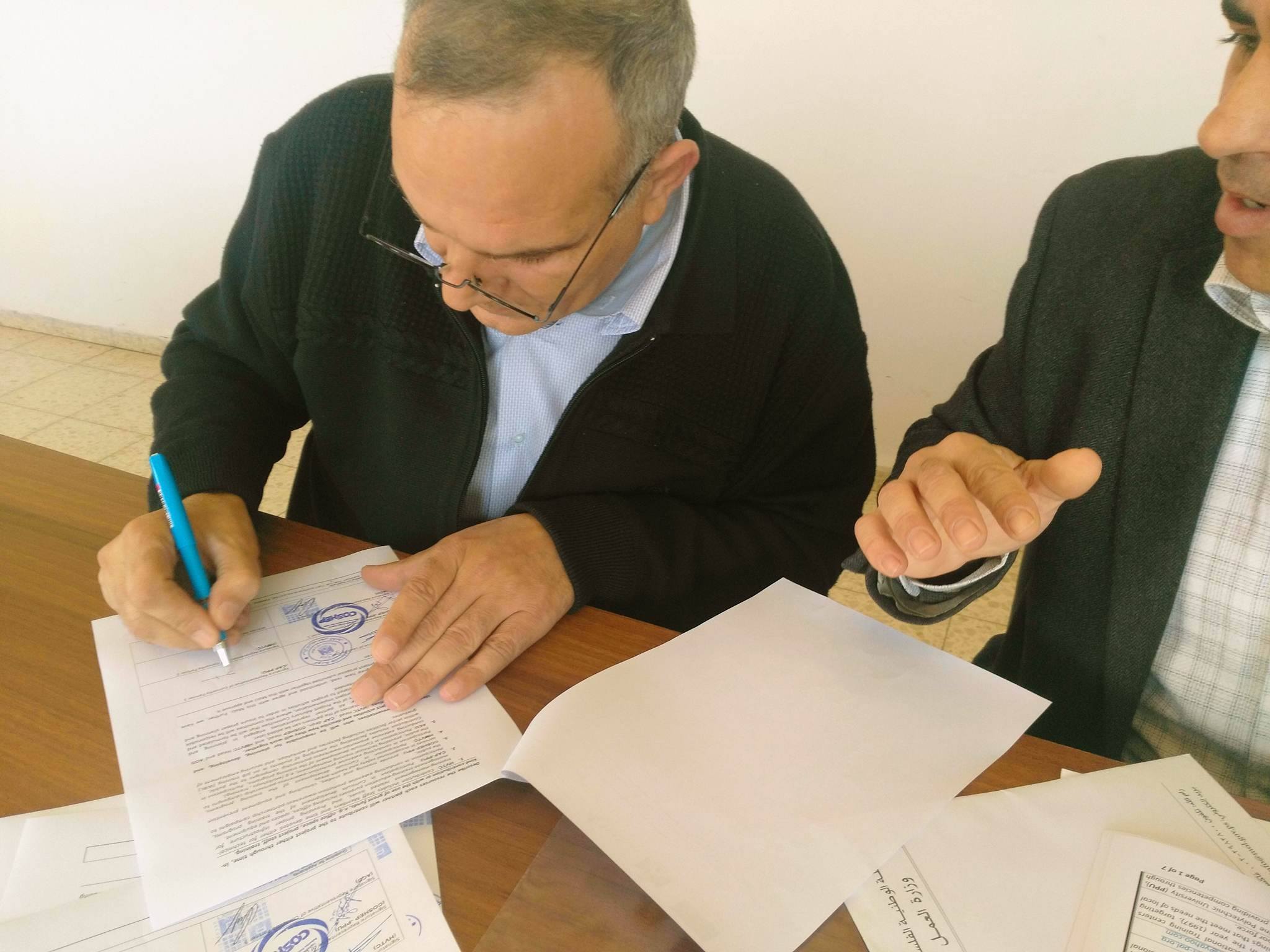 26 اذار 2017 ضمن سياستها في التشبيك مع المجتمع المحلي والمؤسسات الدولية ,كلية المهن التطبيقية ممثلة بعميدها الدكتور اسحق سدر ومركز التدريب المهني في الخليل ممثلا بالاستاذ شحدة الزرو