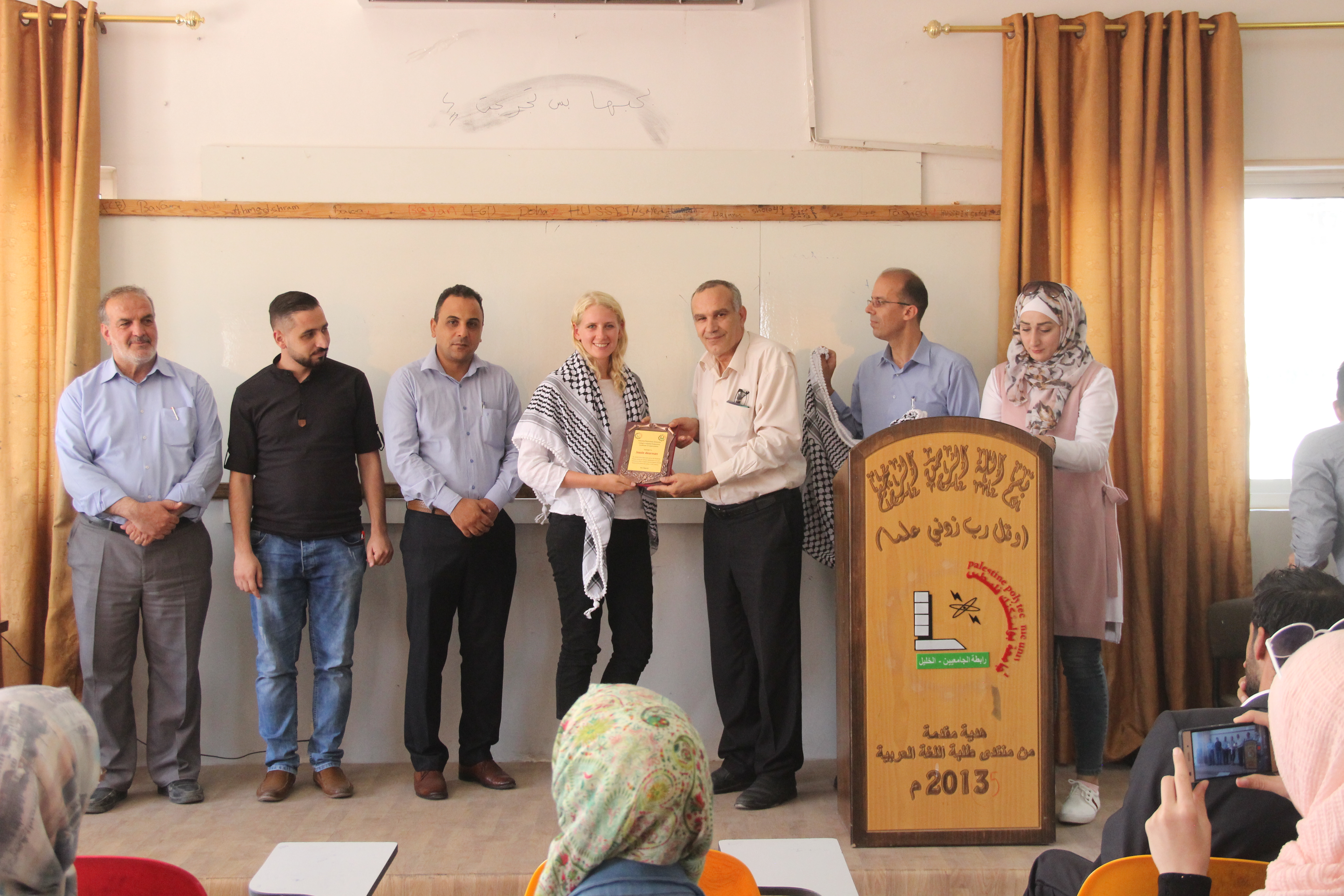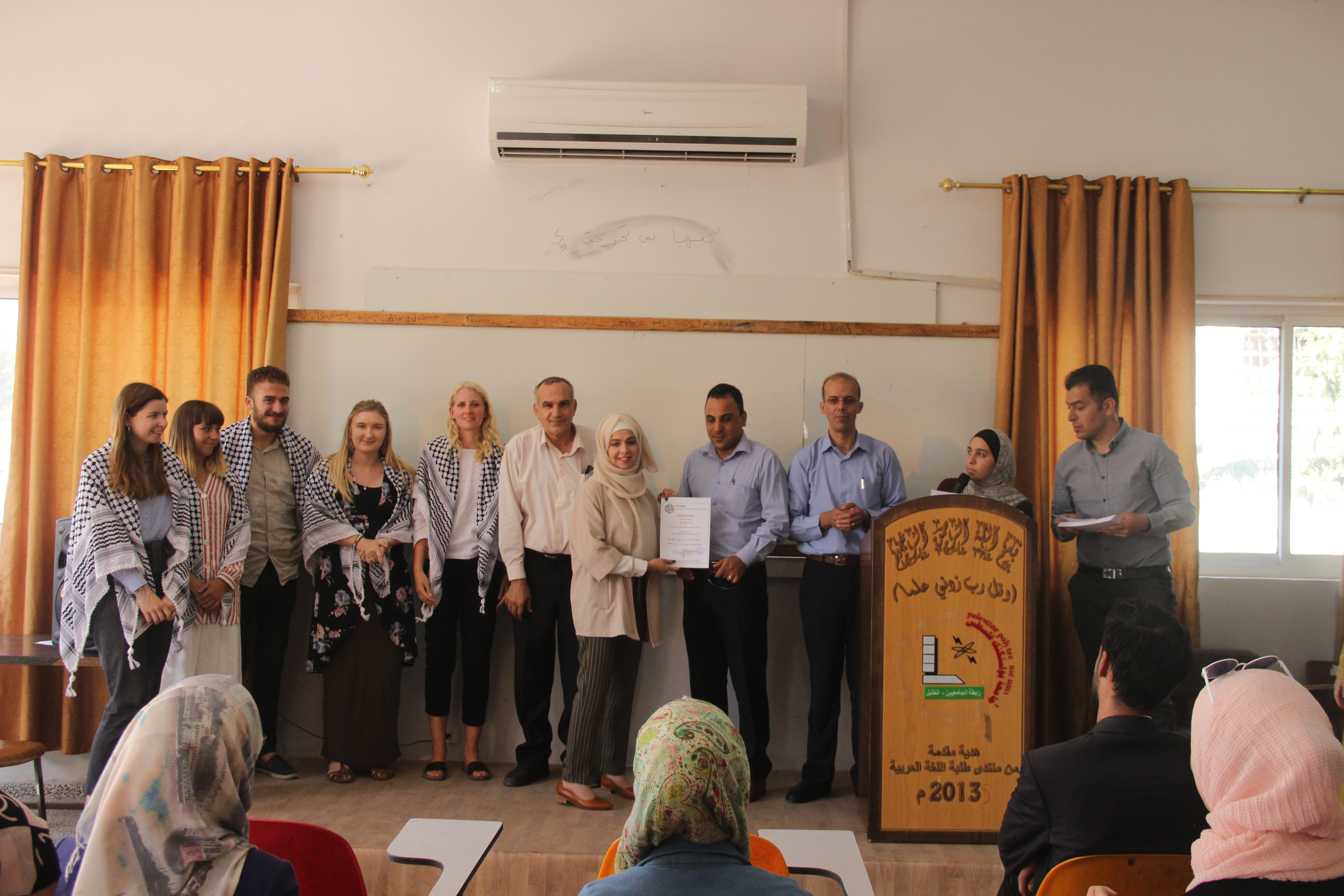 جاء ذلك بحضور منسقة مؤسسة يونيبال في الخليل جسيكا اكريما، وعميد كلية المهن التطبيقية د.اسحق سدر، و رؤساء الدوائر، م.زيدان طه، و أ.وائل عواد، و أ.فؤاد حمدان، واعضاء نادي اللغة الانجليزية أ.حسن قزاز و أ.احسان المحتسب وأ.دانا الجعبري، وحشد من الطلبة المشاركين وذويهم.