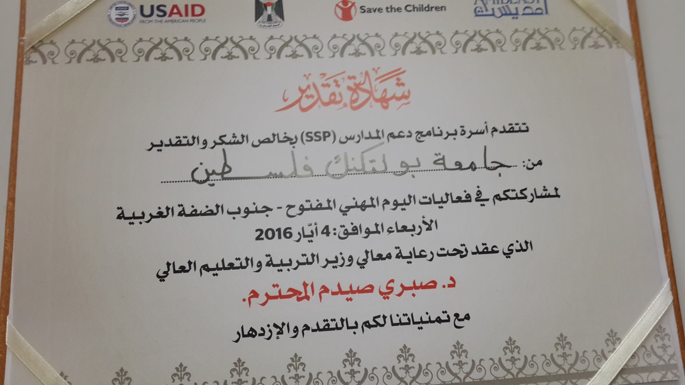 شاركت كلية المهن التطبيقية عن جامعة بوليتكنك فلسطين في فعاليات اليوم المهني المفتوح- جنوب الضفة الغربية الذي أقيم في بيت الطفل الفلسطيني في مدينة الخليل يوم الأربعاء 4 أيار 2016م والذي نظمته أسرة برنامج دعم وتطوير المدارس والذي تنفذه وزارة التربية والتعليم العالي بالتعاون مع مؤسسة الأمديست وإنقاذ الطفل والممول من الوكالة الأمريكية للتنمية USAID ومشاركة عدد من الجامعات والمعاهد التدريبية ومديريات التربية والتعليم في محافظة الخليل وممثلي القطاع الخاص والمؤسسات الحكومية ومؤسسات المجتمع المهني وأصحاب المهن المختلفة بهدف تعريف طلبة المدارس المشاركة بماهية عمل هذه المؤسسات والشركات وطبيعة عملها والتعرف على مختلف المهن الموجودة فيها من أجل مساعدة هؤلاء الطلبة في تحديد إمكاناتهم ومهاراتهم وميولهم وذلك لاختيار مهنة المستقبل التي تلبي طموحاتهم ورغباتهم.