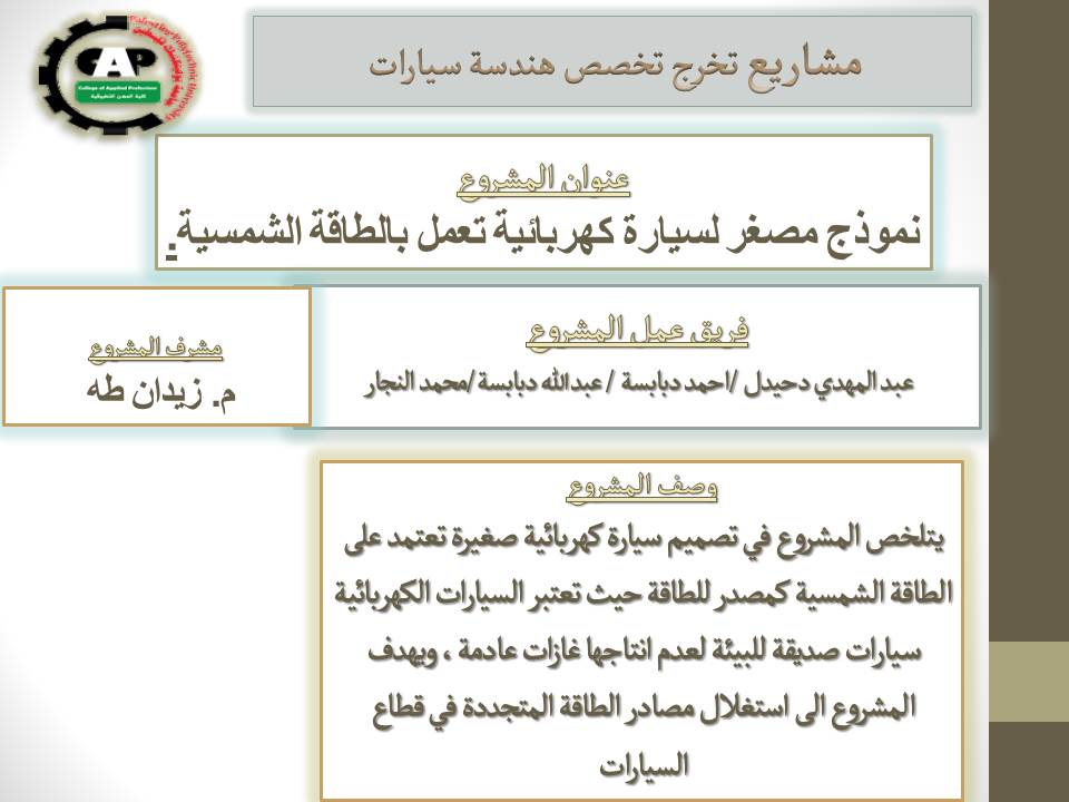 مشروع تخرج هندسة سيارات بعنوان (نموذج مصغر لسيارة كهربائية تعمل بالطاقة الشمسية)